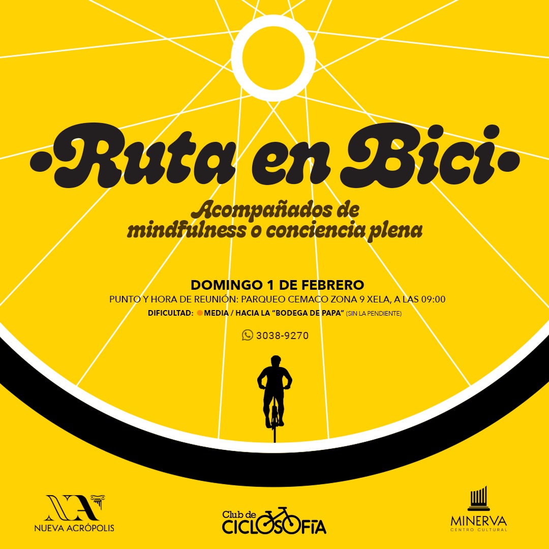 Nueva Acrópolis Xela te invita este domingo 1 de febrero a una nueva ruta de Ciclosofía, una experiencia donde el movimiento del cuerpo se une con la reflexión interior. Ritmo tranquilo, compartiendo el camino, esta vez haremos prácticas de mindfulness. No es una carrera: es un recorrido para disfrutar, conversar y reconectar.